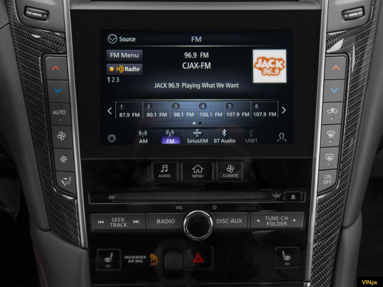 - Radio: INFINITI InTouch w/AM/FM/HD/CD/Navigation -inc: Bose performance series audio 13-speaker stereo, wireless Apple CarPlay, Siri Eyes Free, Android Auto including Google Voice, INFINITI dual HD display system touchscreens, 8-inch upper and 7-inch lower color vehicle-information displays, INFINITI InTuition customizable environment for audio, climate, feature displays and IT functions stored in each INFINITI Intelligent Key, INFINITI voice recognition for audio and vehicle vehicle information systems, speed-sensitive volume control, steering wheel-mounted audio controls, Streaming audio via Bluetooth®, Bluetooth® hands-free phone system w/hands-free text messaging assistant, SiriusXM radio w/advanced audio features and a 3-month complimentary trial, in-glass FM diversity antenna, 2 illuminated USB connection ports (1 type A and 1 type C), 2 12-volt accessory power outlets and auxiliary audio input, navigation w/lane guidance, 3D building graphics, 5 years complimentary trial access to premium traffic and MapCare, voice recognition for navigation functions, including one-shot voice destination entry, SiriusXM Traffic w/3 month complimentary trial access to real-time traffic information, and SiriusXM Travel Link w/3 month complimentary trial access to weather, fuel prices, stock prices, sports scores, movie listings and parking